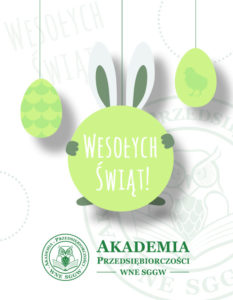 Zdrowych, pogodnych Świąt Wielkanocnych, pełnych wiary, nadziei i miłości. Radosnego, wiosennego nastroju, serdecznych spotkań w gronie rodziny i wśród przyjaciół życzy zespół Akademii Przedsiębiorczości WNE SGGW.